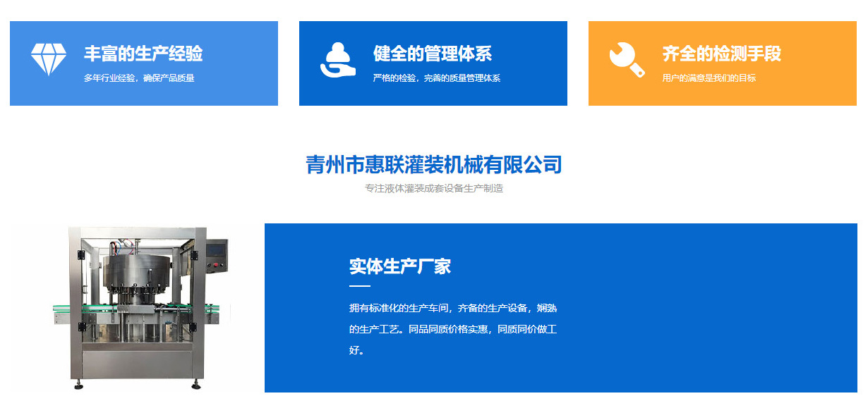 青州市惠聯(lián)灌裝機械有限公司是一家集生產(chǎn)研發(fā)、銷售、服務于一體的液體灌裝成套設備生產(chǎn)企業(yè),可根據(jù)廠家要求設計合理液體灌裝生產(chǎn)線,為用戶提供技術咨詢、設計工藝、場區(qū)平面布置、工藝改造、設備安裝調(diào)試等完善服務。 公司生產(chǎn)制造各種類型液體灌裝機、過濾機,水處理設備及液體灌裝成套設備。主要產(chǎn)品有:白酒、葡萄酒、黃酒等酒水灌裝機、食用油、機油、潤滑油等油類灌裝機、醬油醋、老抽、生抽等調(diào)味品灌裝機、防凍液、玻璃水灌裝機、酒精、84消毒液灌裝機、車用尿素灌裝機、口服液灌裝機、洗滌劑灌裝機等多種液體、膏體灌裝設備,全自動/半自動灌裝機型號多,規(guī)格全,洗瓶機、瓶子封口機、打塞機、熱縮機、瓶子烘干機、貼標機、噴碼機、輸送線、裝箱機、水處理設備等全套生產(chǎn)線相關配套設備齊全,自產(chǎn)自銷,一站式購齊,售后無憂。